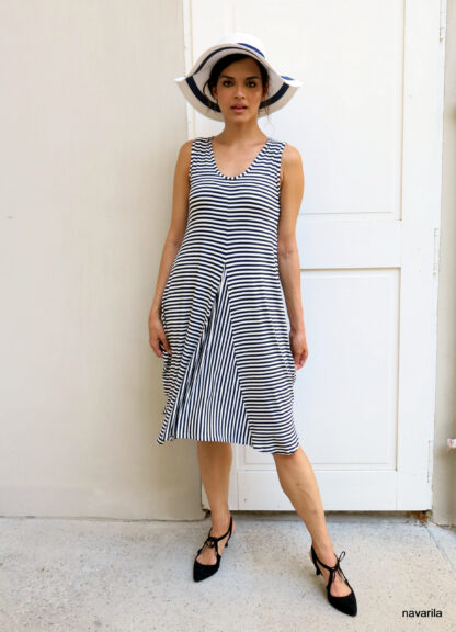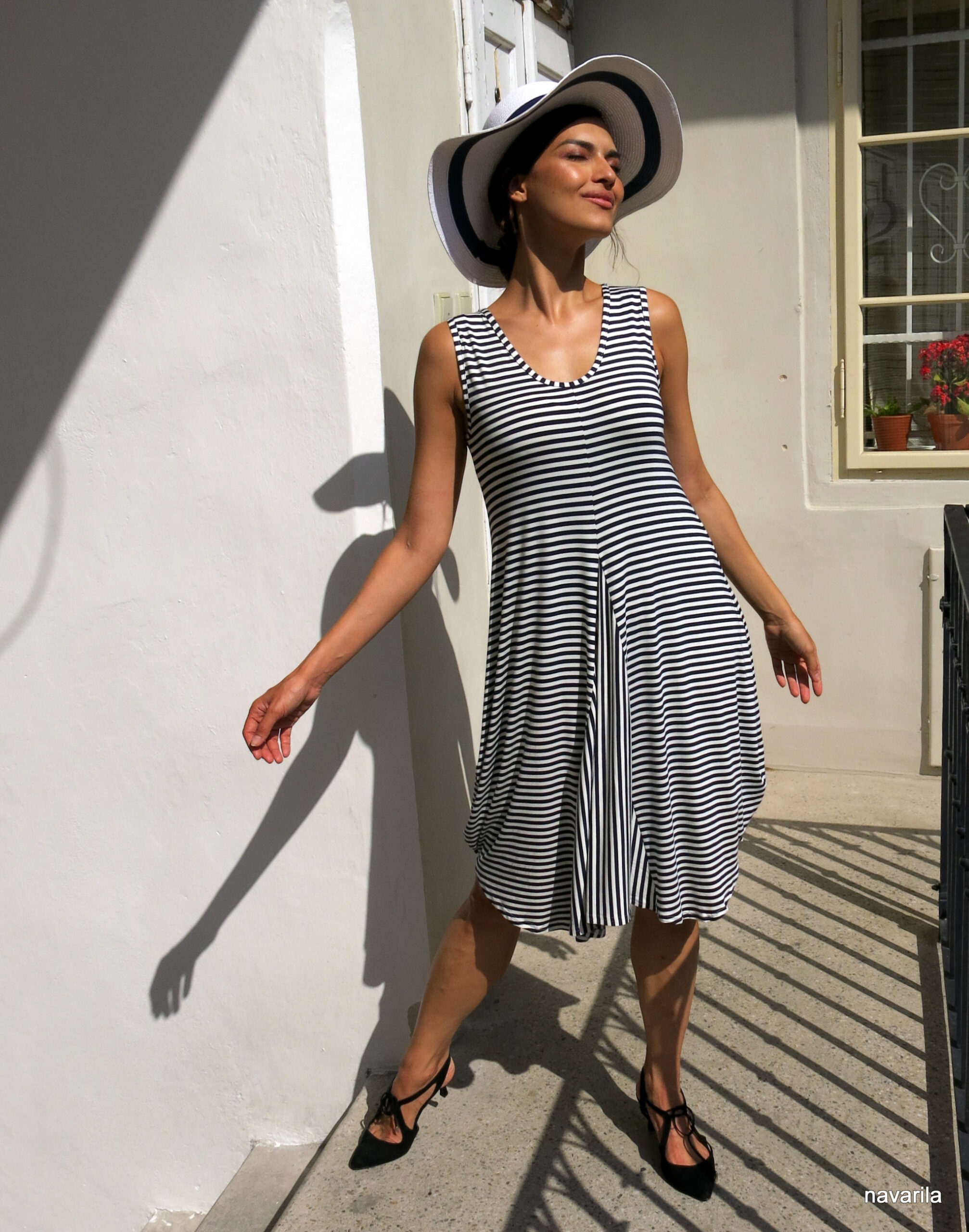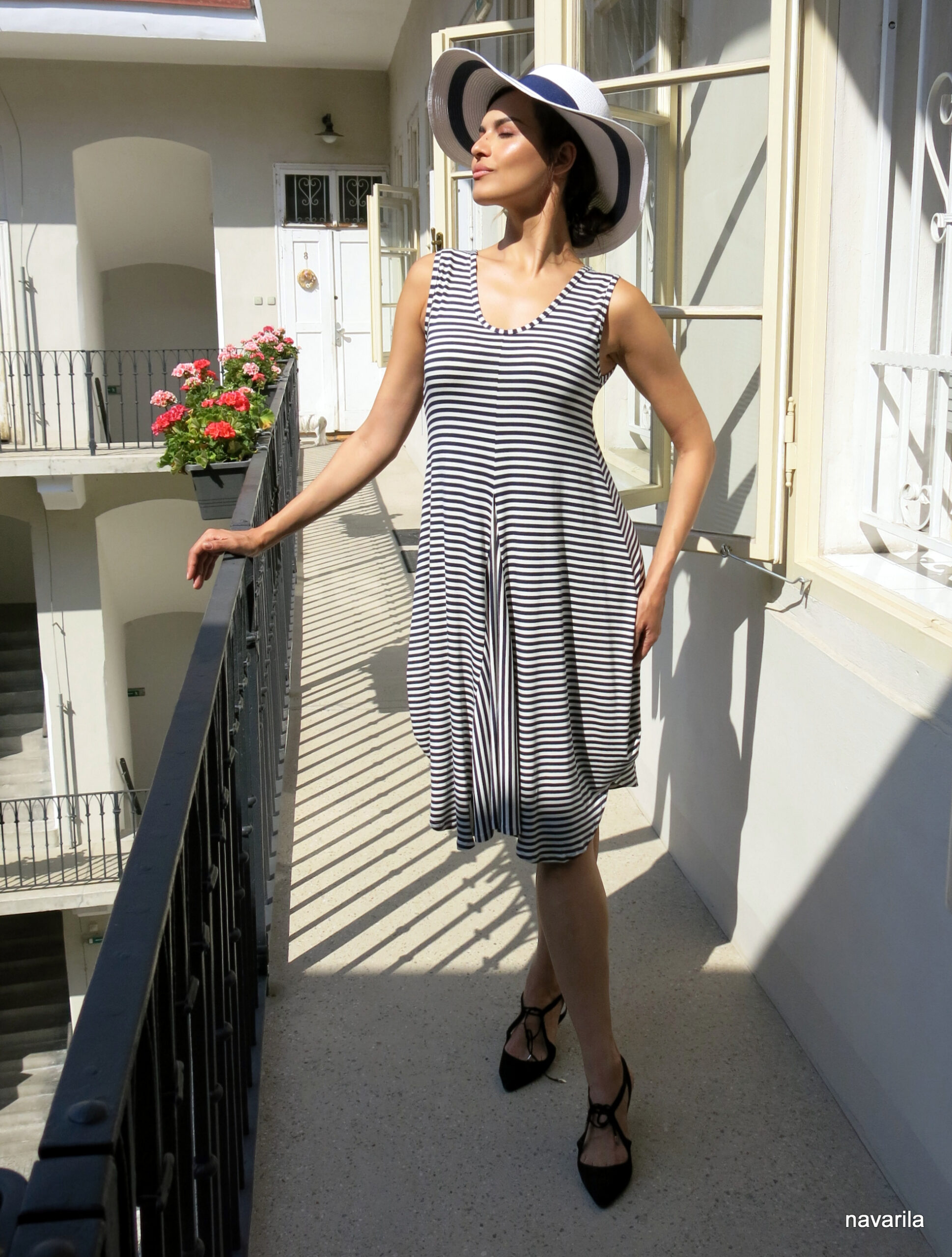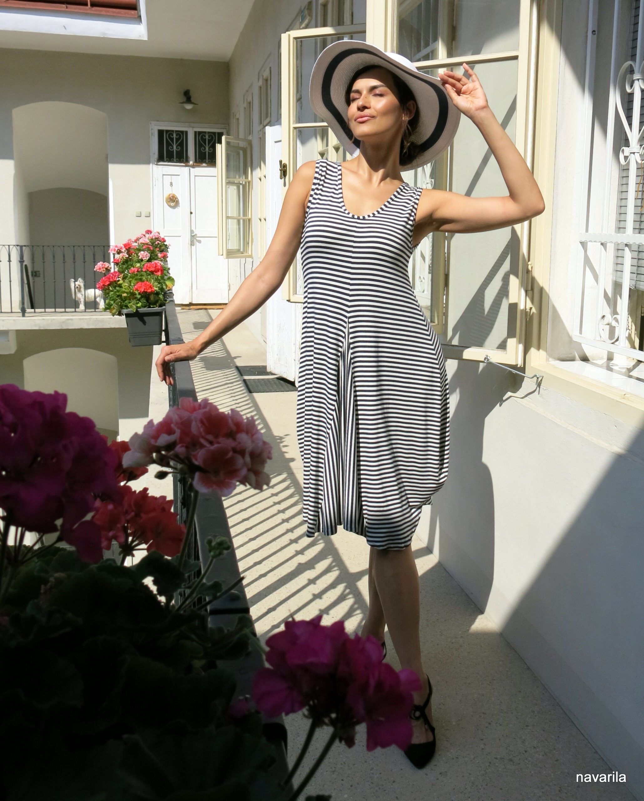 Proužkované šaty bez rukávů, také trochu balónového střihu ale rozšířené vsadkou na PD, takže sluší každé postavě.