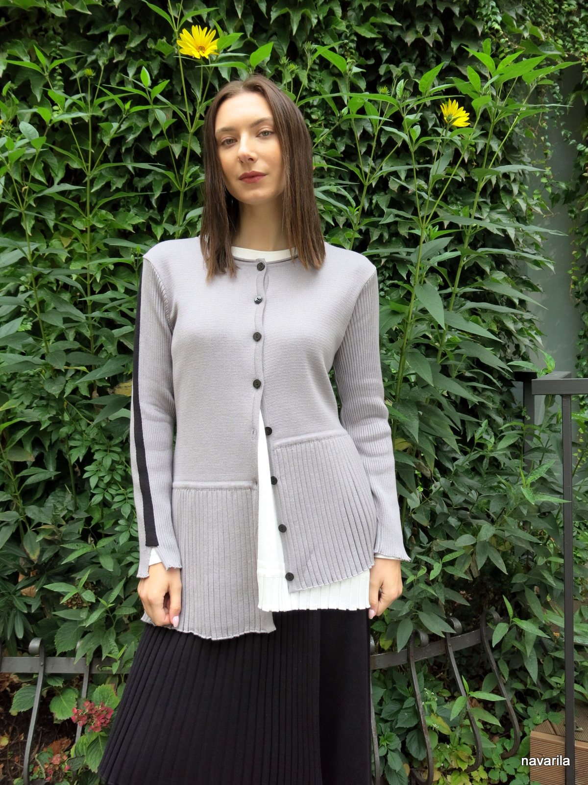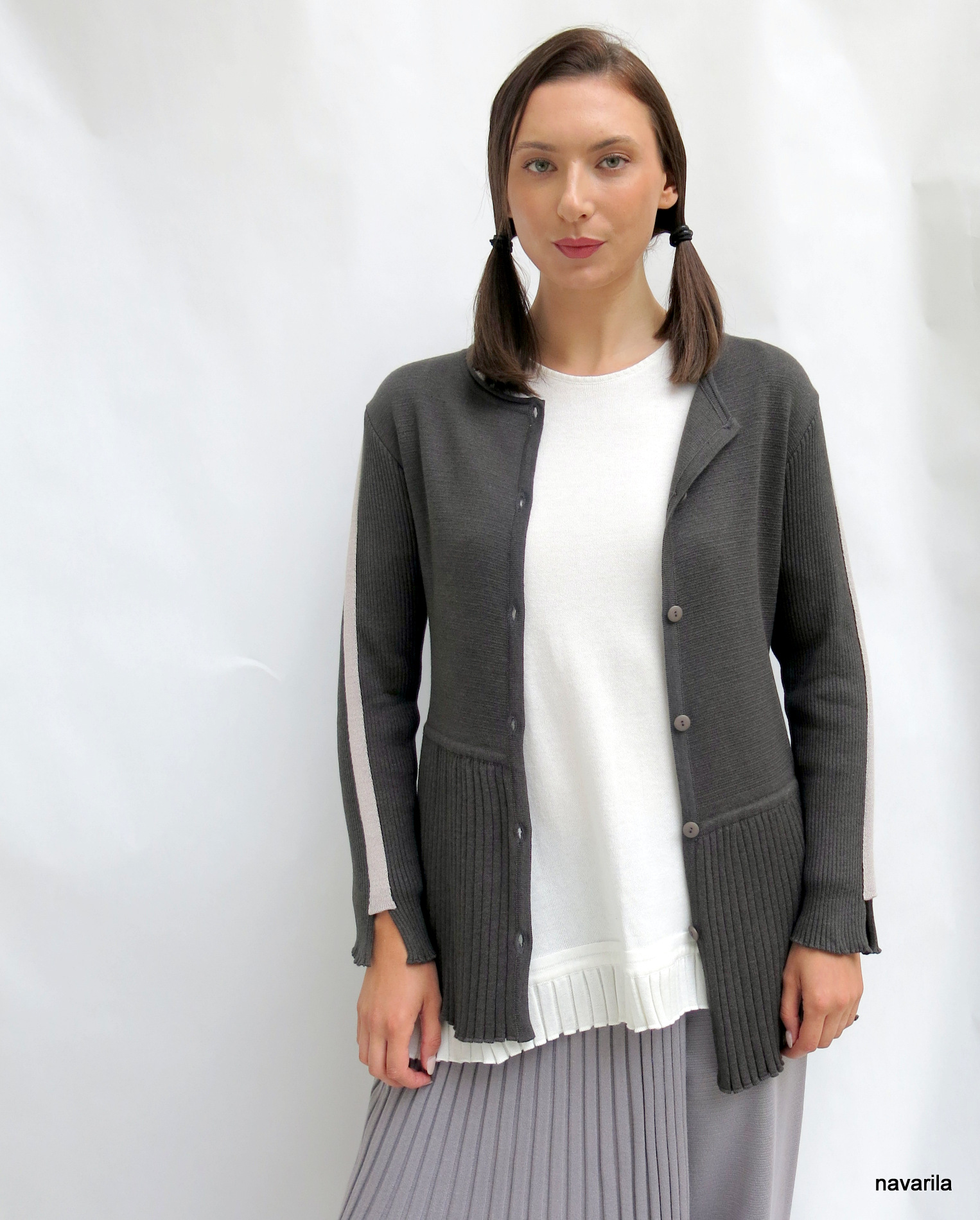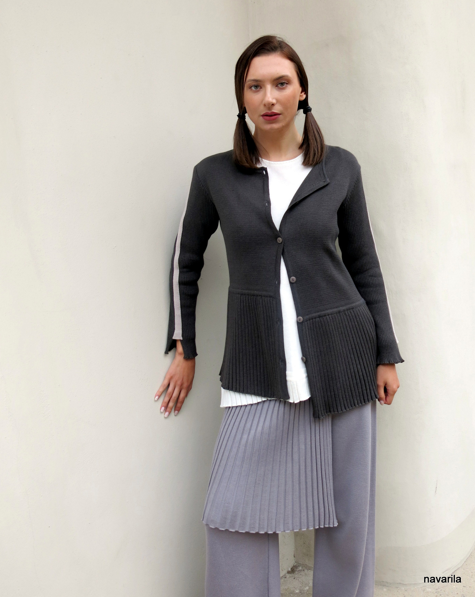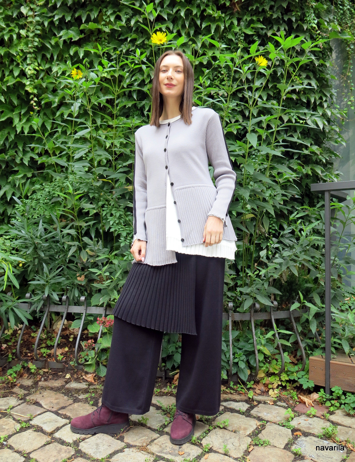 Je přesně tím svetrem, kterým vykouknete z davu, přitom příjemným a snadno uživatelným. Pleteno z organické bavlny 50/50, příze drží tvar, nekouše, můžete prát na jemný program v pračce. Na rukávech s rozparky jsou našité jinobarevné pásky, dolní část je pletena s plisé v asymetrické délce.