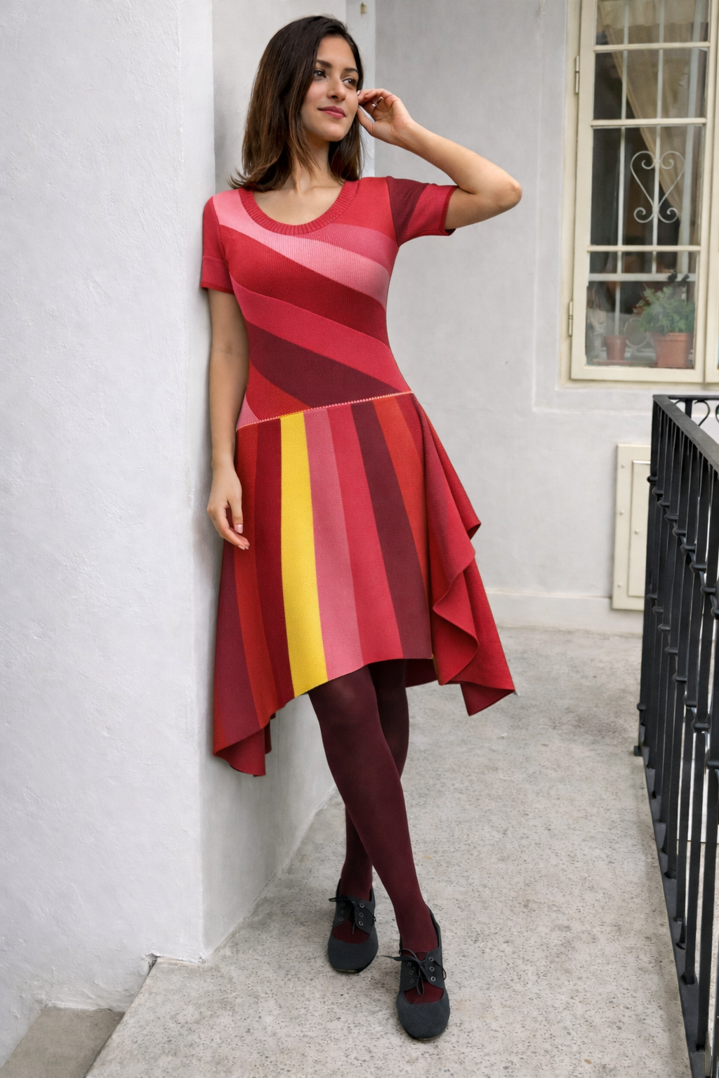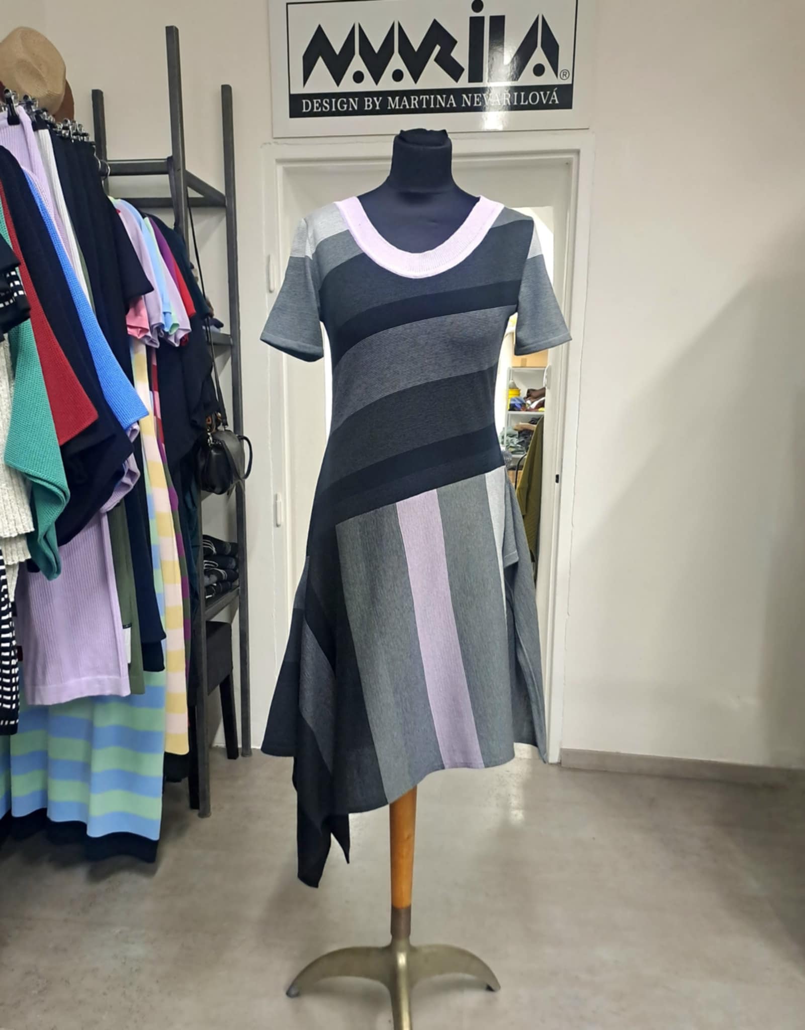Nepřehlédnutelné originální šaty s asymetrickou pruhovanou sukní, s volánem a krátkými rukávy.Každý kus je originál. Je možné domluvit malé úpravy na přání, např. Délku šatů, rukávů, barevnost.