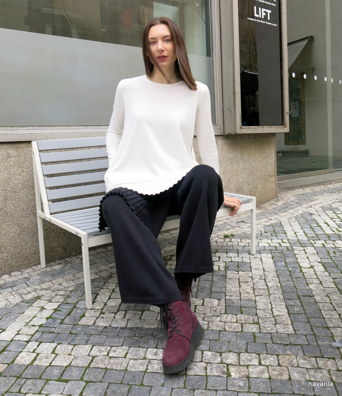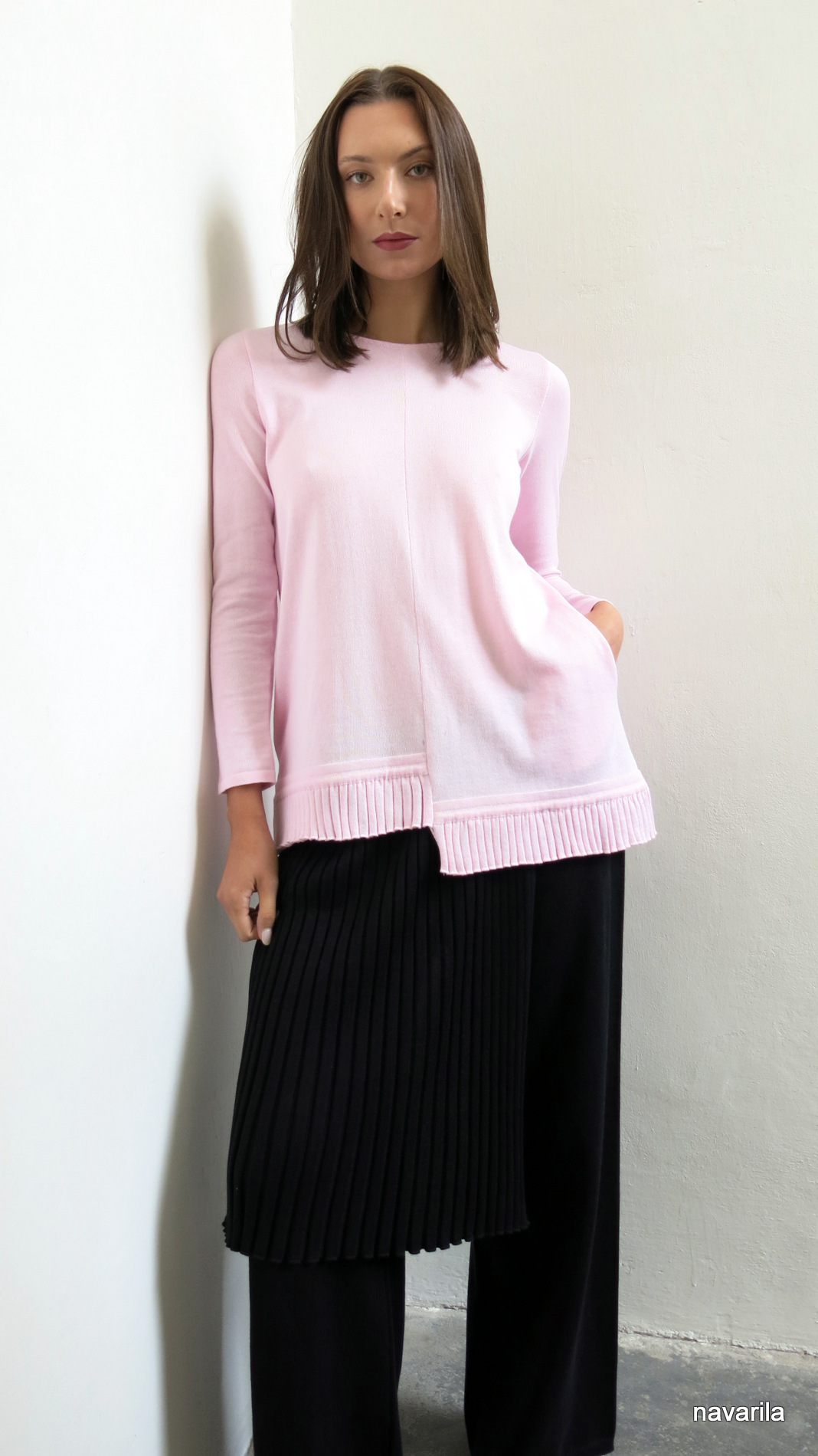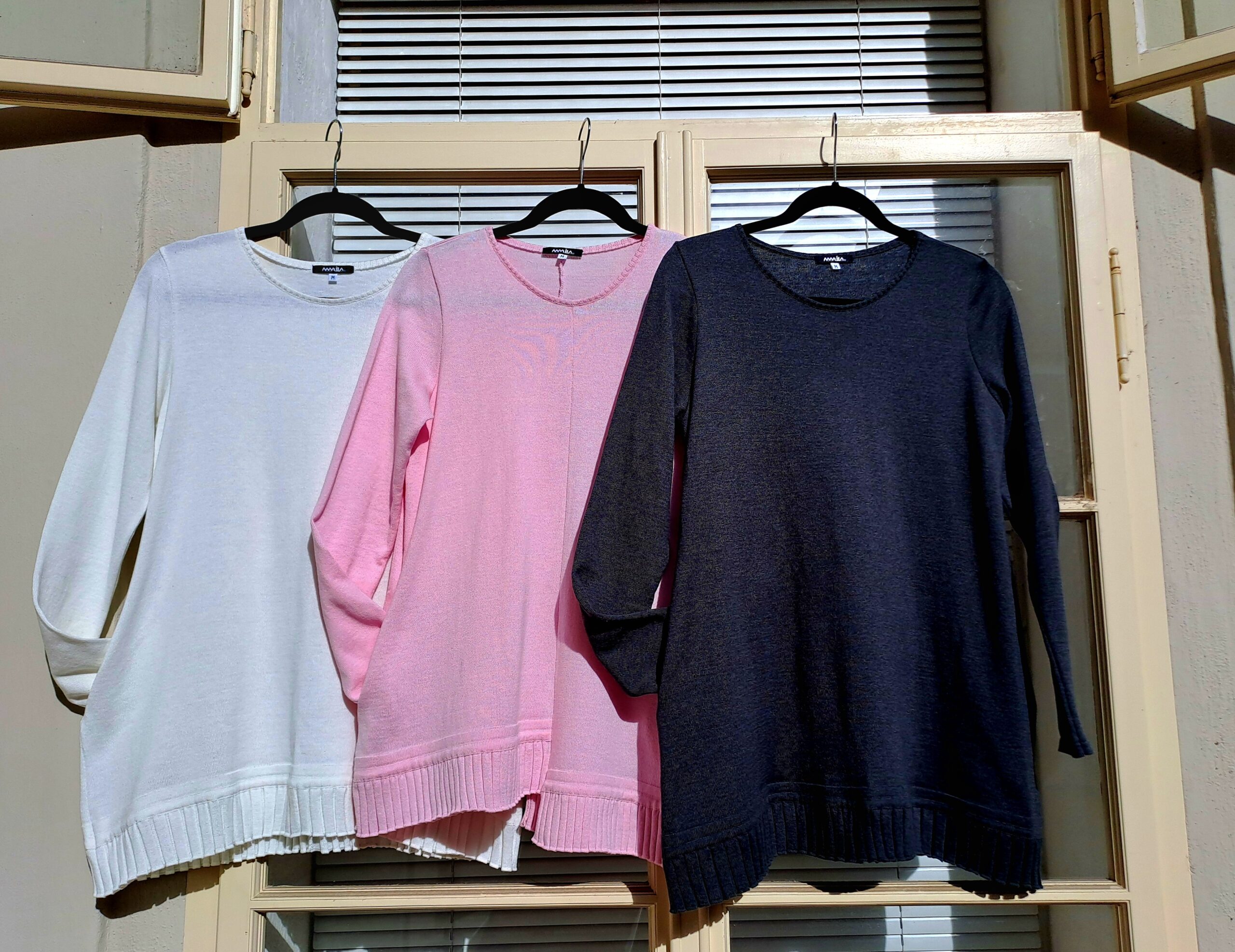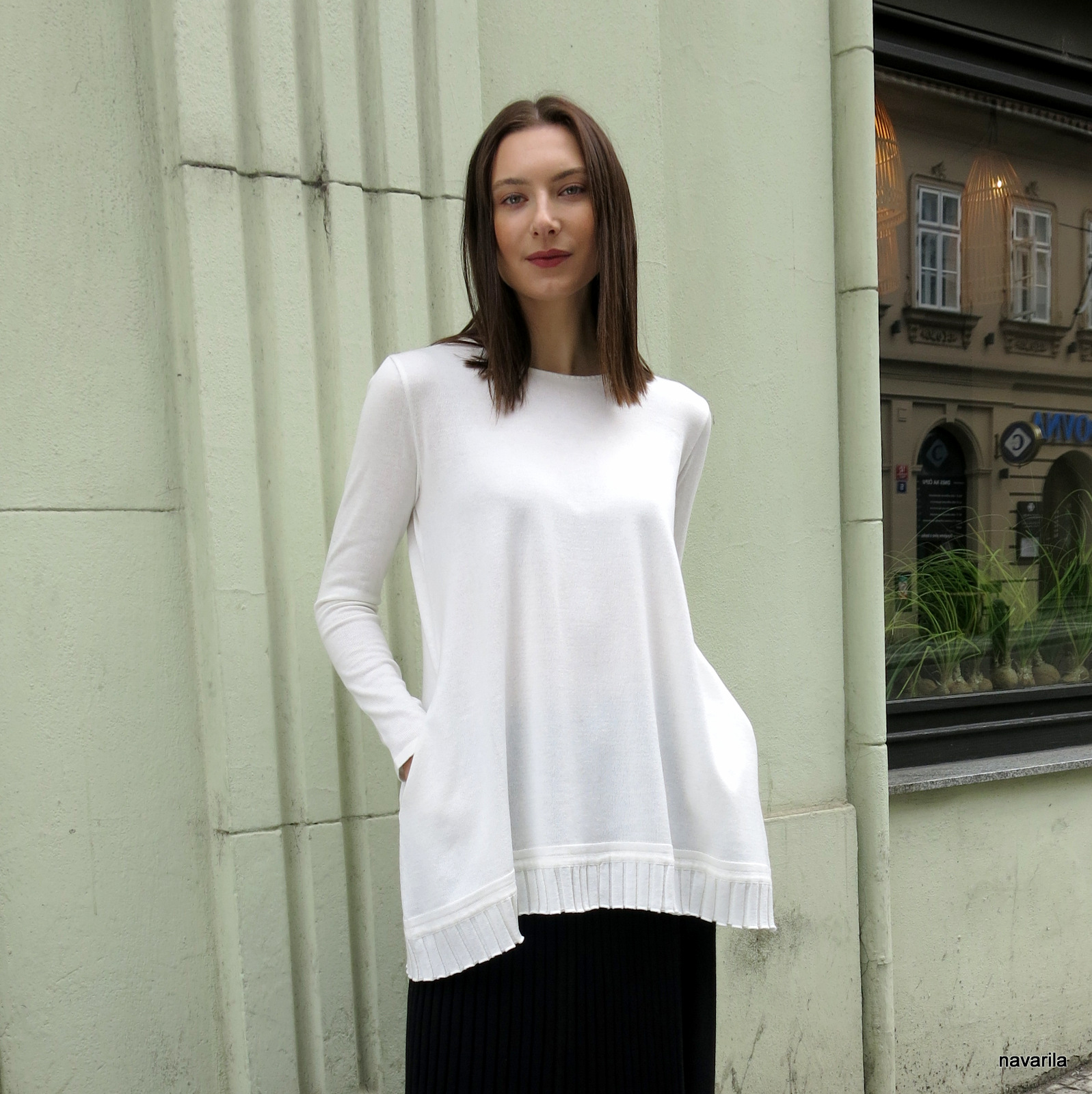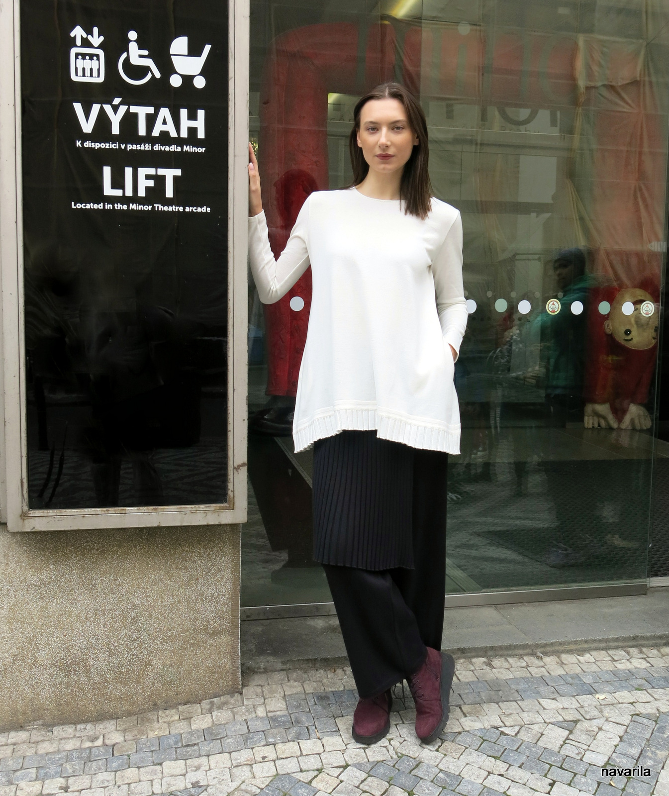 Svetřík VANY je naprosto univerzální, rozšířený, dlouhý a s kapsami! Celý dolní lem je lemovaný jemným plisováním a je pletený z biobavlny 50/50, takže absolutně příjemný omak, nekouše a ještě ho můžete něžně vyprat v pračce. Něžně znamená na program pro vlněné kousky, s teplotou do 30st.